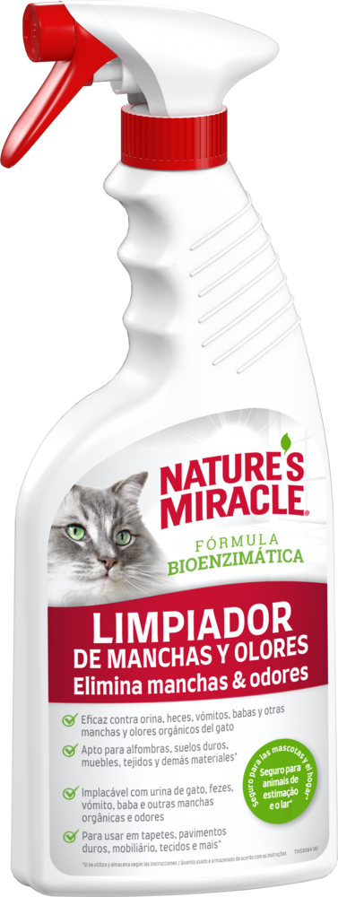 O Nature's Miracle® Stain & Odour Remover Gato limpa a sujidade comum dos cães e é implacável com diferentes tipos de sujidade, como urina, fezes, vómito, baba e outras manchas e odores orgânicos. Graças à sua fórmula bioenzimática de ação rápida, que trata da sujidade comum dos animais de estimação, essa sujidade pode ser removida facilmente e os odores neutralizados. A fórmula baseada em bactérias produz enzimas quando entra em contacto com sujidade orgânica e continua a atuar até esta sujidade desaparecer. Quando usado e conservado segundo as instruções, o produto é seguro para animais e para a casa, e pode ser usado em diferentes tipos de pavimento, como tapetes, pavimentos duros, móveis, e tecidos. O Nature's Miracle® Stain & Odour Remover Gato é a escolha ideal para remover a sujidade comum dos cães e deixa um aroma leve e fresco a citrinos.